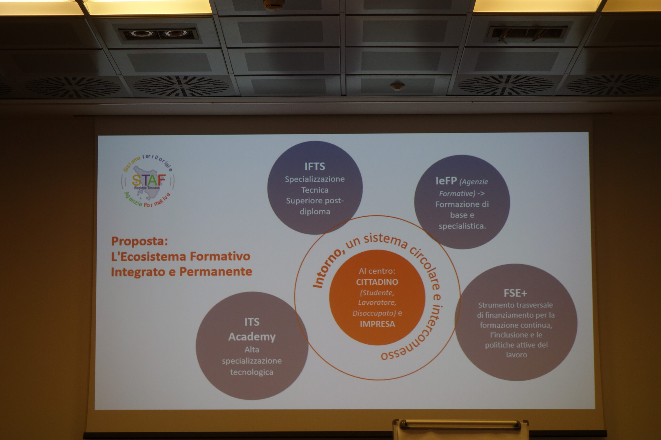 Vincenzo Bianculli di Pluriversum, ha illustrato una panoramica delle diverse generazioni e del rapporto con il mondo del lavoro, con un focus sui NEET, giovani tra i 15 e i 29 anni che non sono né occupati né inseriti in percorsi di studio o formazione, evidenziando come l’unica soluzione sia legata al dialogo per comprendere le loro esigenze. Marco Guastini, dell’Associazione STAF, ha invece presentato il punto di vista delle agenzie formative, spiegando come il potenziamento di percorsi tecnici sia fondamentali, soprattutto per sviluppare le nuove professioni, creando un sistema integrato tra IeFP, IFTS e ITS. Infine Alessandro De Rosa, Responsabile formazione Fondazione PIN Prato, ha concluso portando il punto di vista delle Università dove il numero di iscritti sta crescendo, dopo un periodo di calo.