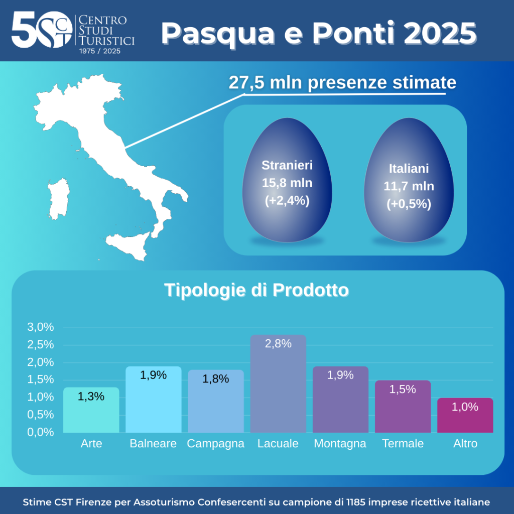 Saranno oltre 27,5 milioni i pernottamenti per il periodo di Pasqua e dei ponti di primavera in Italia: è quanto stimato dal Centro Studi Turistici di Firenze per Assoturismo Confesercenti.