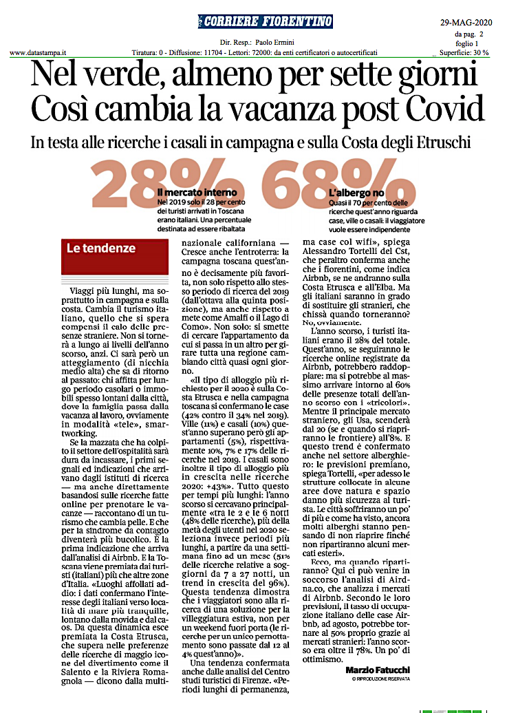 Corriere Fiorentino del 29/05/2020: “Nel verde, almeno per sette giorni. Così cambia la vacanza post Covid“